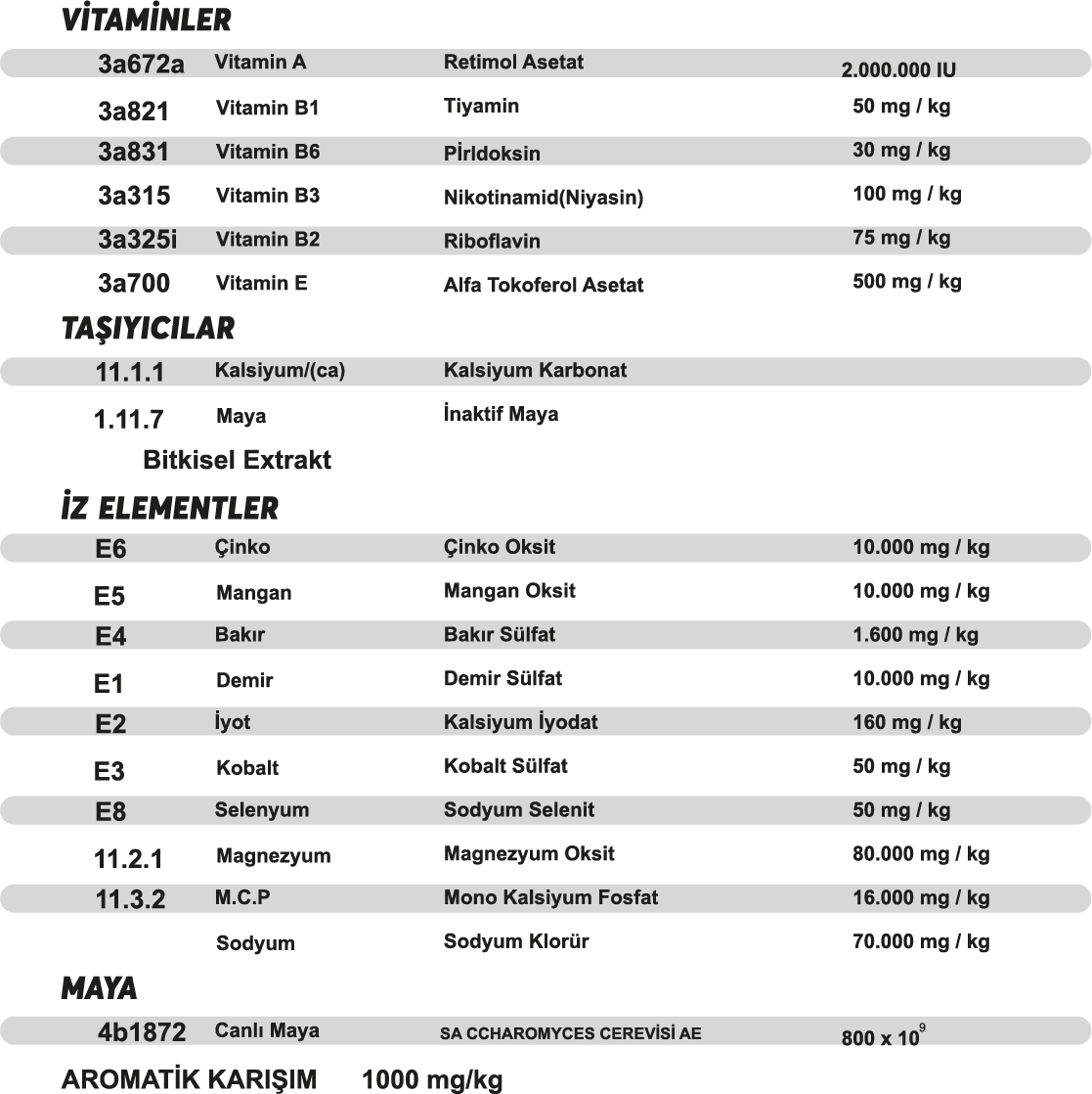 Büyükbaş ve küçükbaş hayvanların bağlayıcı ile birlikte canlı maya, inaktif maya, vitamin ve iz mineral ihtiyaçlarını karşılamak amacıyla hazırlanmış premikstir.