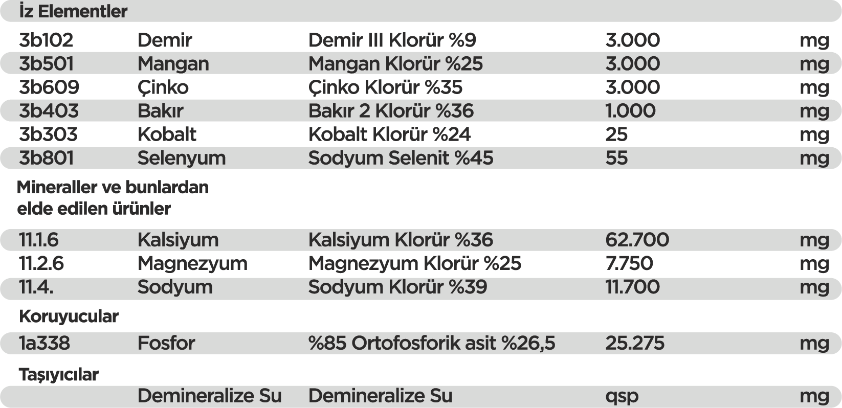 Büyükbaş, küçükbaş hayvanlar ile etçi ve yumurta tavuklarının sularına mineral ihtiyacını karşılamak için her ton içme suyuna 1 litre kullanılır.