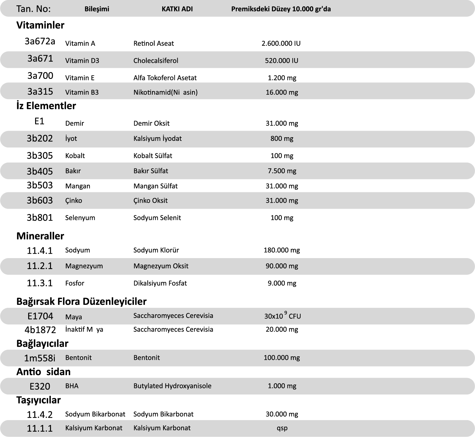 Büyükbaş ve küçükbaş hayvanların bağlayıcı ile birlikte canlı maya, inaktif maya, vitamin ve iz mineral ihtiyaçlarını karşılamak amacıyla hazırlanmış premikstir.