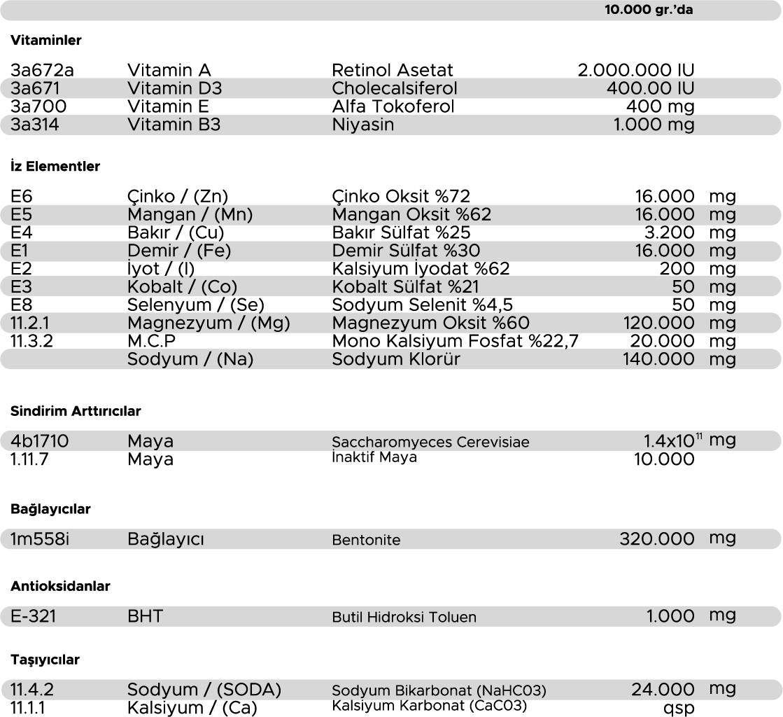 Büyükbaş ve küçükbaş hayvanların bağlayıcı ile birlikte canlı maya, inaktif maya, vitamin ve iz mineral ihtiyaçlarını karşılamak amacıyla hazırlanmış premikstir.