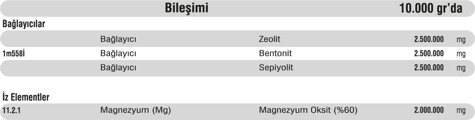 Aflotoksinlerin sebep olduğu verim düşüklüğü vb. sorunların engellenmesine yardımcı olabilir. Zeolit bazlı güçlü bir Bağlayıcıdır. Bozuk, küflenmiş silaj, pancar posası, saman, kesif yem ve hammaddelerin hayvanlara verilmesi durumda aflotoksinleri bağlayarak dışkıyla dışarı atılmasına yardımcı olabilir. Fazla protein tüketimine bağlı ortaya çıkan amonyağın tutularak atılmasına yardımcı olabilir. Vitaminlerin ve diğer besin maddelerini bağlamaz. Doğal bir mineral üründür.