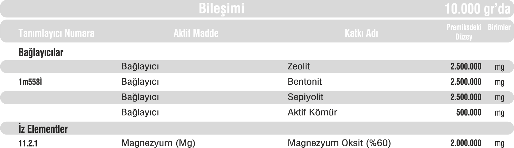 Aflotoksinlerin sebep olduğu verim düşüklüğü vb. sorunların engellenmesine yardımcı olabilir. Zeolit bazlı güçlü bir Bağlayıcıdır. Bozuk, küflenmiş silaj, pancar posası, saman, kesif yem ve hammaddelerin hayvanlara verilmesi durumda aflotoksinleri bağlayarak dışkıyla dışarı atılmasına yardımcı olabilir. Fazla protein tüketimine bağlı ortaya çıkan amonyağın tutularak atılmasına yardımcı olabilir. Vitaminlerin ve diğer besin maddelerini bağlamaz. Doğal bir mineral üründür.